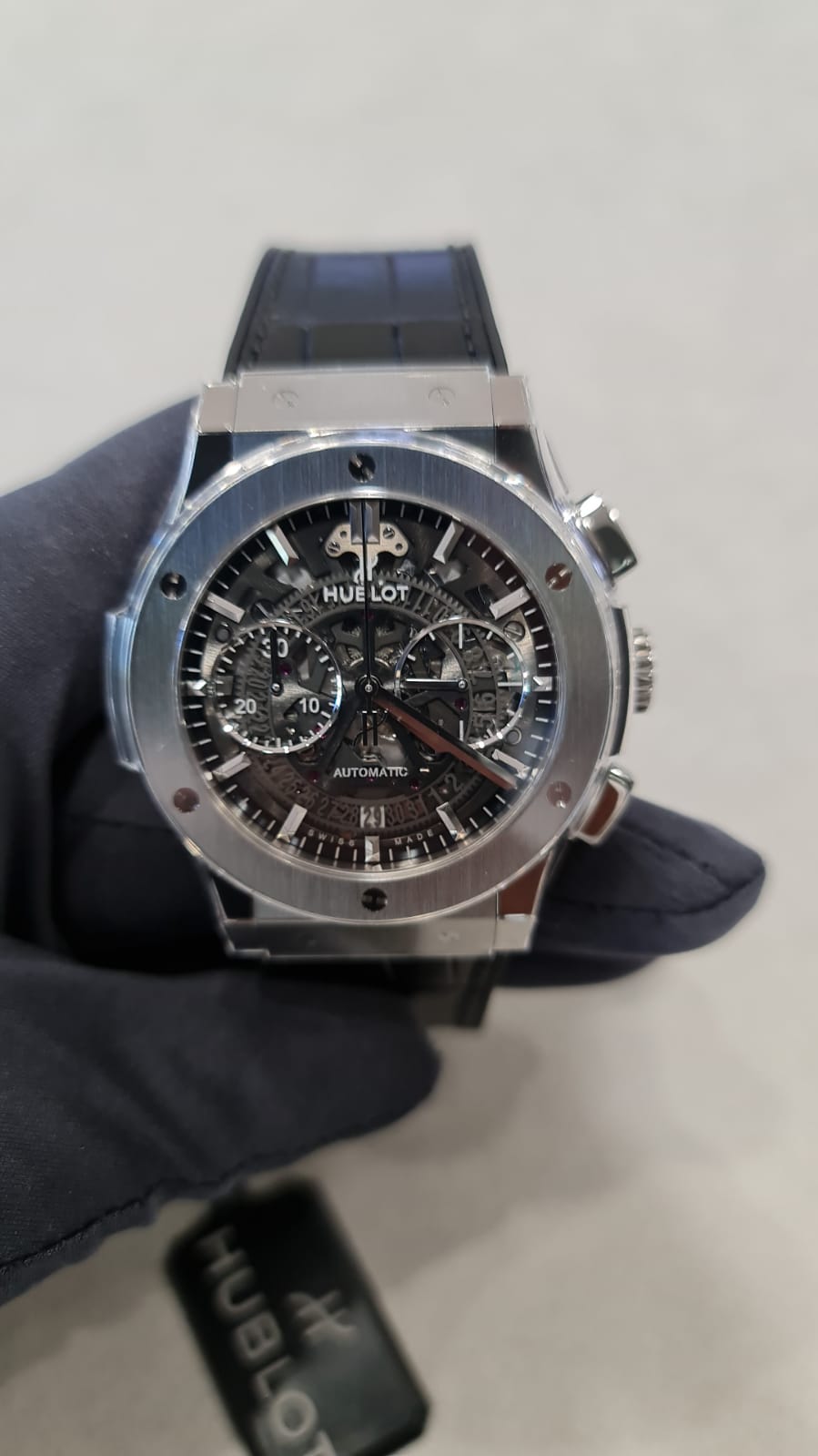 - Fitted with a Hublot design, open-worked, tungsten rotor.