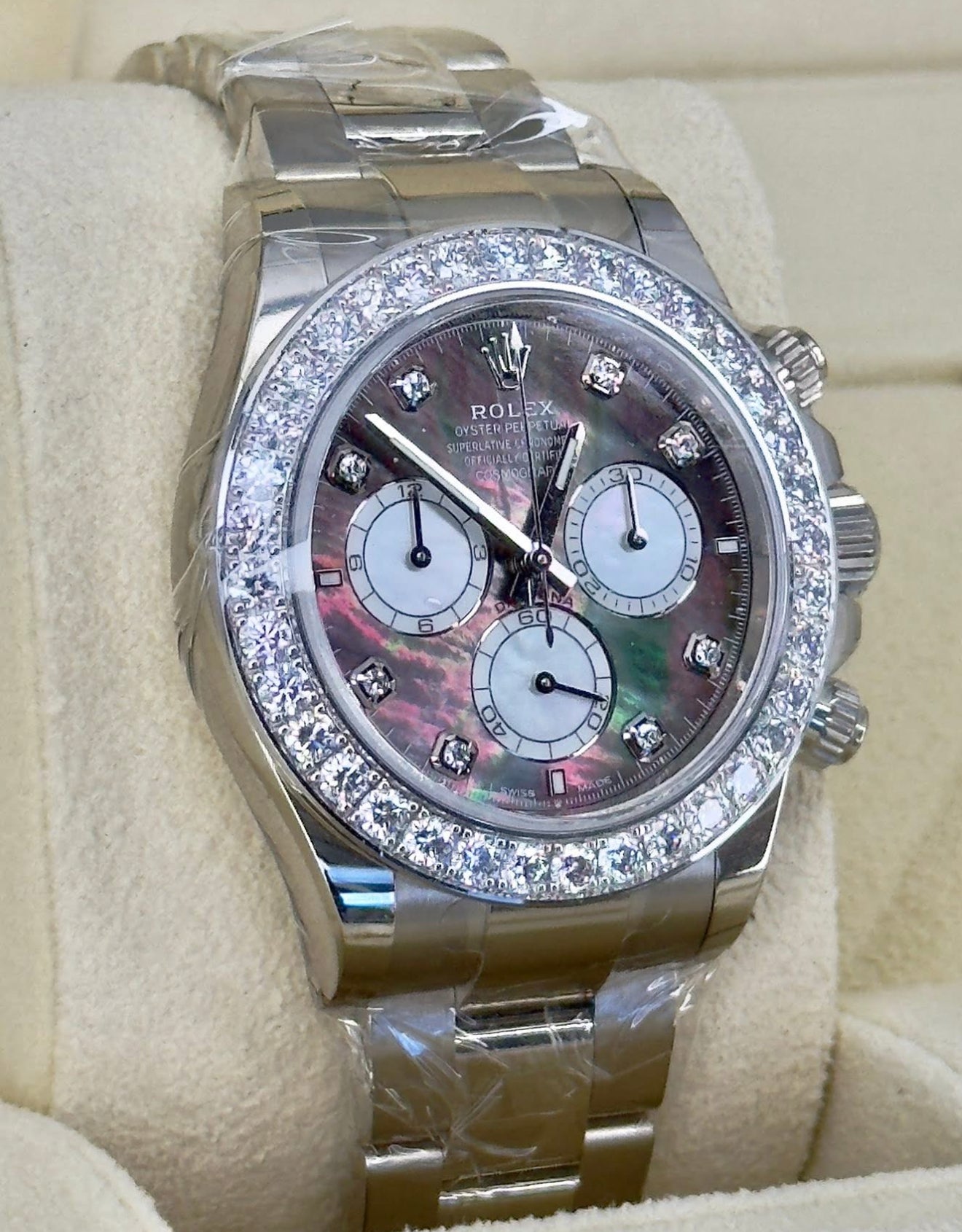 Dial Color | Black and white mother-of-pearl set with diamonds |