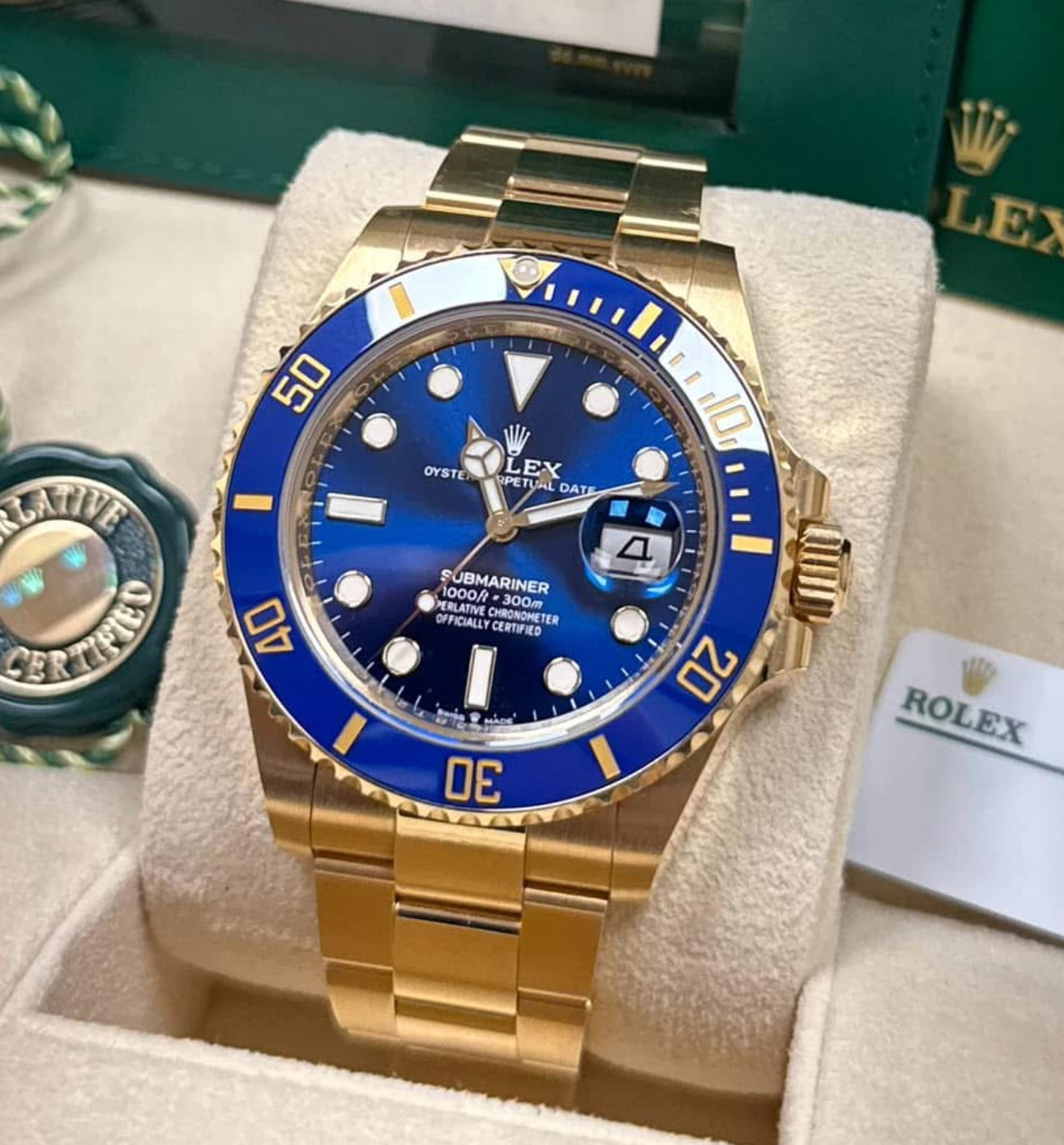 41 mm 18K yellow gold case, screw-down crown with triplock triple waterproofness system, unidirectional rotatable bezel with blue Cerachrom insert and gold coated numerals and graduations, scratch-resistant sapphire crystal with cyclops lens over the date, blue dial, Rolex calibre 3235 automatic movement, approximately 70 hours of power reserve, 18K yellow gold Oyster bracelet with flat three-piece links, folding Oysterlock buckle with glidelock extension system. Waterproof to 300 meters.